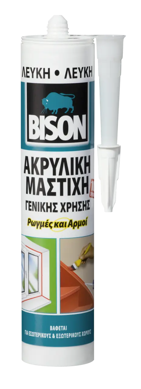 Κατάλληλο για τη στεγανοποίηση ενώσεων με ελάχιστη κίνηση, αρμών και ρωγμών σε κουφώματα θυρών και παραθύρων, περβάζια παραθύρων, επενδύσεις τοίχων, σκάλες, σοβατεπί, τοίχους, γυψοσανίδες, ταβάνια και σωληνώσεις. Είναι επίσης κατάλληλο για τη σφράγιση ρωγμών μικρού και κανονικού μεγέθους σε τοίχους. Κολλά σε τούβλα, (σπογγώδες) σκυρόδεμα, εφαρμογές τοιχοποιίας, γύψινα, ξύλο, μέταλλο και πολλές πορώδεις επιφάνειες. Δεν κολλά σε επιφάνειες από άσφαλτο, πολυαιθυλένιο, πολυπροπυλένιο, PTFE και σιλικόνη. Για τη στεγανοποίηση τζαμιών παραθύρων, χρησιμοποιήστε το στεγανοποιητικό BISON Glazing Sealant.