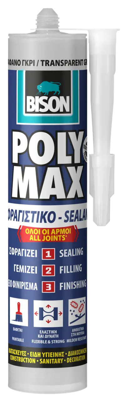 Το BISON Poly Max® Sealant είναι ένα υψηλής ποιότητας, μόνιμα ελαστικό, βαφόμενο και ανθεκτικό στη μούχλα σφραγιστικό "όλα σε ένα" (μπορεί να αντικαταστήσει τα ακρυλικά, σιλικονούχα και PU σφραγιστικά) για αδιάβροχη σφράγιση αρμών και ραφών, γέμισμα οπών και ρωγμών χωρίς συρρίκνωση και φινίρισμα εργασιών σφράγισης με αισθητικό τρόπο.