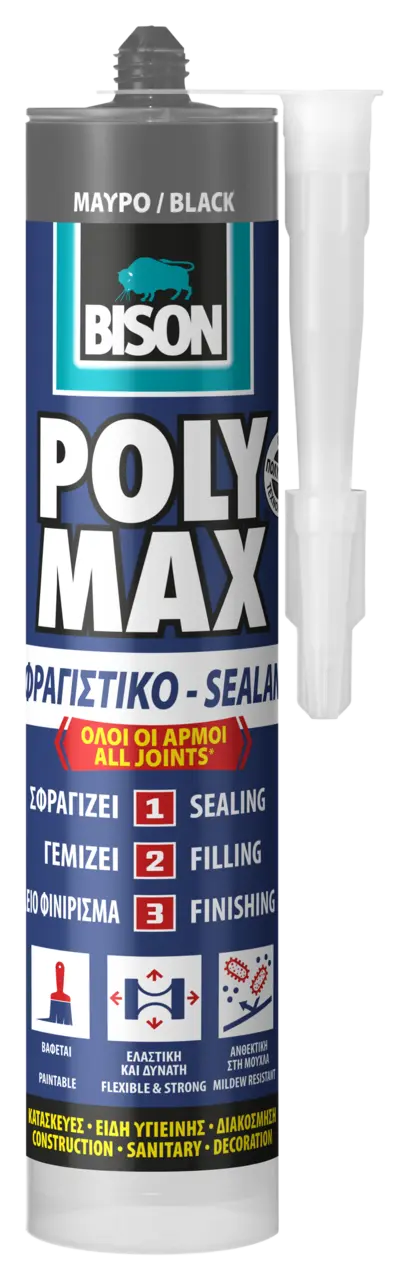 Το BISON Poly Max® Sealant είναι ένα υψηλής ποιότητας, μόνιμα ελαστικό, βαφόμενο και ανθεκτικό στη μούχλα σφραγιστικό "όλα σε ένα" (μπορεί να αντικαταστήσει τα ακρυλικά, σιλικονούχα και PU σφραγιστικά) για αδιάβροχη σφράγιση αρμών και ραφών, γέμισμα οπών και ρωγμών χωρίς συρρίκνωση και φινίρισμα εργασιών σφράγισης με αισθητικό τρόπο.