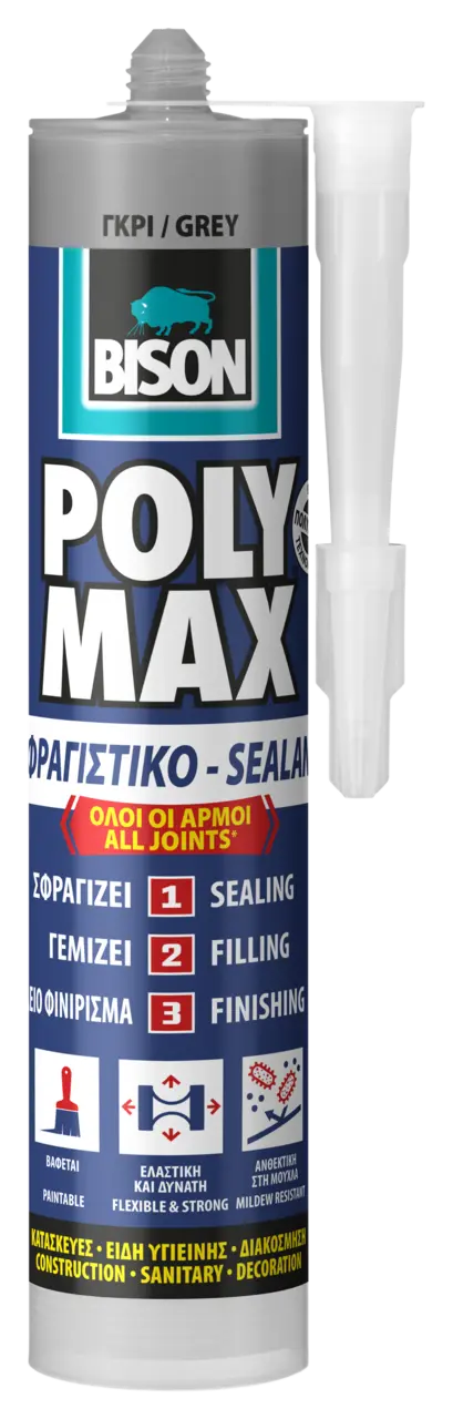 Το BISON Poly Max Σφραγιστικό είναι ένα υψηλής ποιότητας, μόνιμα ελαστικό, βαφόμενο και ανθεκτικό στη μούχλα σφραγιστικό "όλα-σε-ένα" (μπορεί να αντικαταστήσει τα ακρυλικά, σιλικονούχα και PU σφραγιστικά) για αδιάβροχη σφράγιση αρμών και ραφών, γέμισμα οπών και ρωγμών χωρίς συρρίκνωση και τελείωμα εργασιών σφράγισης με αισθητικό τρόπο.