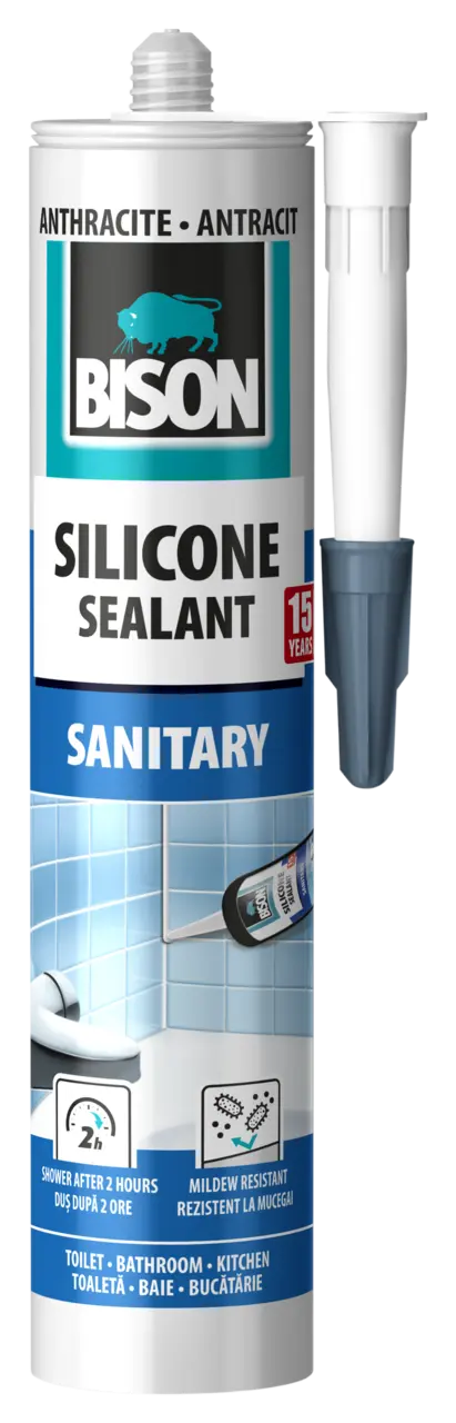 For the sealing of seams, joints and crevices between wall, bath, shower cubicle, bathroom sink and kitchen counter in the sanitary areas like bathrooms, toilet and kitchens. Specifically for sealings in sanitary and ceramic applications, such as joints between wall and floor tiles, bath, shower cubicle, bathroom sink, kitchen counter, sink and tile walls. Also ideal for acrylic bathtubs, plastic shower bases and shower walls. Adheres to clear glass, ceramics, glazed tiles, enamel, metal, wood and various synthetics. Does not bond to bitumen, polyethylene, polypropylene and PTFE. Not suitable for aquariums, for this we recommend BISON Silicone Sealant Glass Transparent.
