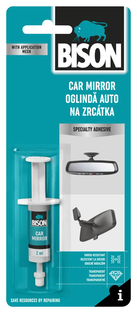 Car Mirror is an anaerobic adhesive, meaning that it is designed to cure in absence of oxygen, in combination with the impregnated mesh. Adhesive outside bonded areas will not cure due to presence of oxygen.