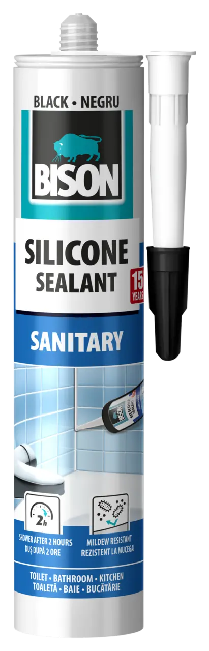 For the sealing of seams, joints and crevices between wall, bath, shower cubicle, bathroom sink and kitchen counter in the sanitary areas like bathrooms, toilet and kitchens. Specifically for sealings in sanitary and ceramic applications, such as joints between wall and floor tiles, bath, shower cubicle, bathroom sink, kitchen counter, sink and tile walls. Also ideal for acrylic bathtubs, plastic shower bases and shower walls. Adheres to clear glass, ceramics, glazed tiles, enamel, metal, wood and various synthetics. Does not bond to bitumen, polyethylene, polypropylene and PTFE. Not suitable for aquariums, for this we recommend BISON Silicone Sealant Glass Transparent.