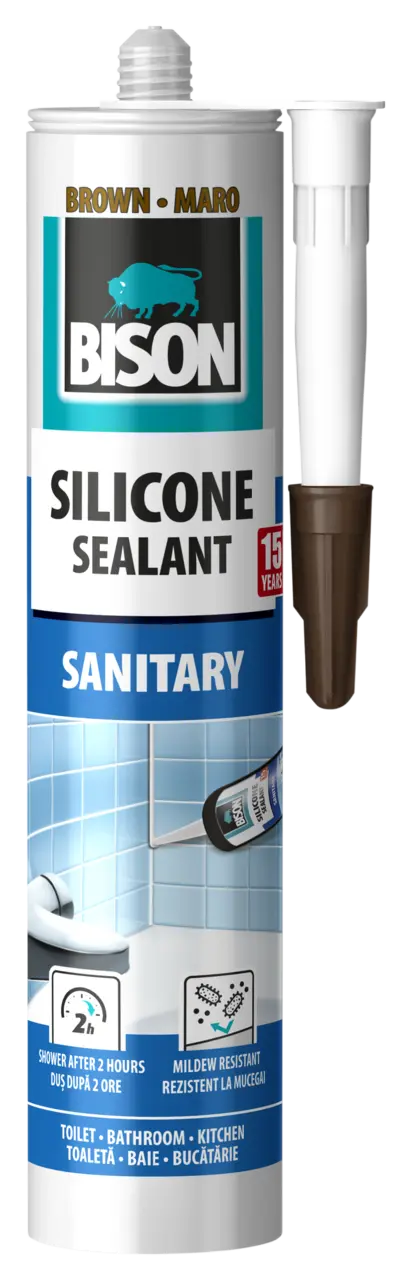 For the sealing of seams, joints and crevices between wall, bath, shower cubicle, bathroom sink and kitchen counter in the sanitary areas like bathrooms, toilet and kitchens. Specifically for sealings in sanitary and ceramic applications, such as joints between wall and floor tiles, bath, shower cubicle, bathroom sink, kitchen counter, sink and tile walls. Also ideal for acrylic bathtubs, plastic shower bases and shower walls. Adheres to clear glass, ceramics, glazed tiles, enamel, metal, wood and various synthetics. Does not bond to bitumen, polyethylene, polypropylene and PTFE. Not suitable for aquariums, for this we recommend BISON Silicone Sealant Glass Transparent.