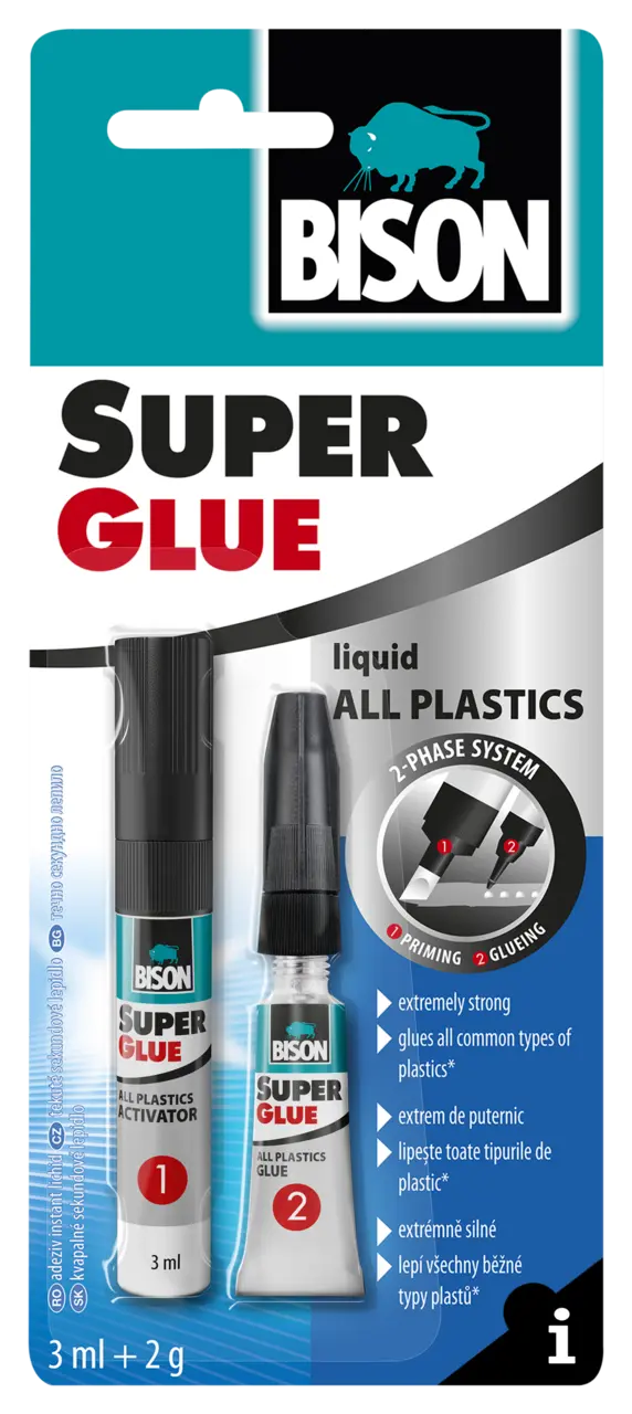 Ideal for small-area bonds. Glues all common types of plastics, like PE, PP, PVC, PS, ABS, rubber, and much more.