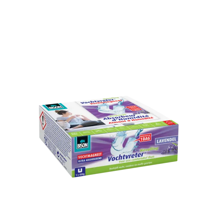 450 g agissent pendant approximativement 3 mois dans une pièce d’environ 45 m³ et absorbent environ 0,5 litre d’eau, en fonction de la température, de l’humidité et de la dimension de la pièce.