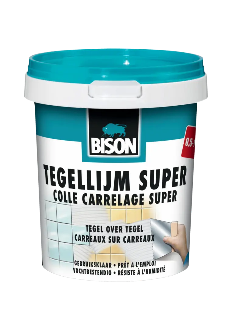 À l'aide d'une spatule ou du côté plat du peigne à colle, appliquez uniformément une couche de colle pas trop épaisse sur le support ou sur le bord de fixation du carreau et ensuite peignez la colle à l'aide d'une spatule à denture large (Peigne à colle Bison NO3). Après y avoir appliqué la colle, positionnez correctement le carreau en le poussant et pressez fermement ou tapotez légèrement avec un maillet en caoutchouc. Veillez, tout particulièrement dans les pièces humides, à parfaire adéquatement les joints entre les carreaux. Temps de séchage de 24 à 48 heures. Évitez de travailler sur des superficies de plus de 2 m² à la fois, car l'adhérence initiale de la colle serait insuffisante. Lorsque vous posez des carreaux sur des carreaux, une fois la colle appliquée, attendez 10 à 15 minutes avant de poser les carreaux. Réalisez les joints après environ une semaine en fonction de la température et du support.