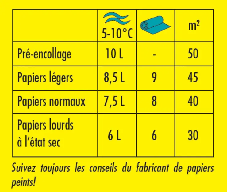 Verser le contenu dans de l’eau froide tout en mélangeant jusqu’à obtenir une colle sans grumeaux. Attendre 10 minutes et mélanger à nouveau vigoureusement. La colle est maintenant prête à l’emploi. Encoller les lés uniformément avec la brosse, en particulier les bords. Replier les parties encollées sur elles-mêmes pour laisser le papier s'imbiber. Ensuite, tapisser en respectant les conseils de pose du fabricant. La colle préparée peut s’utiliser plusieurs jours, à condition d’être entreposée dans un emballage bien fermé.
