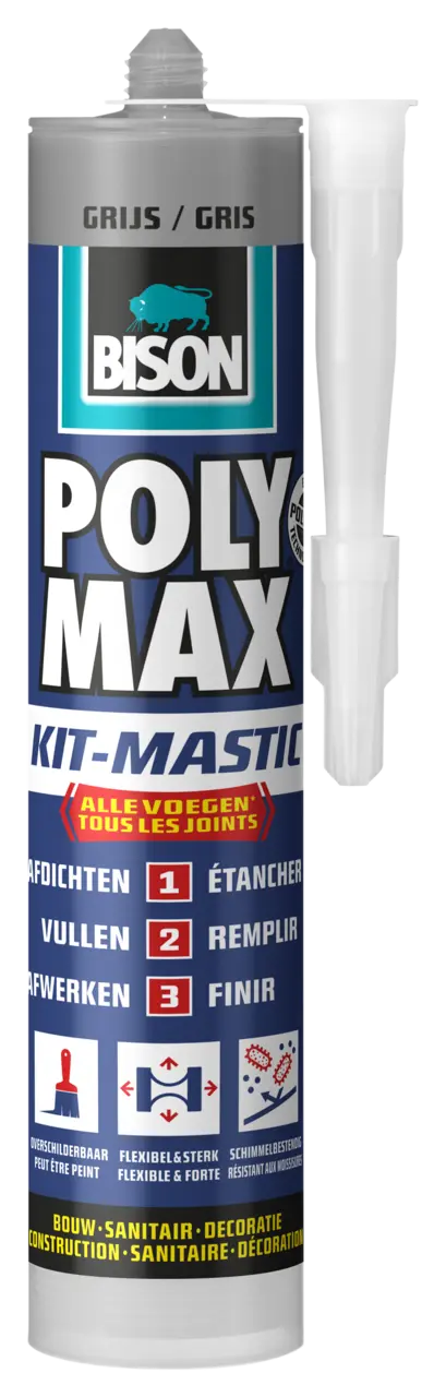 La surface doit être propre et sèche, exempte de poussière et de graisse. Pour un bon résultat final, appliquer du ruban de masquage des deux côtés du joint. Couper la cartouche pour l’ouvrir jusqu’au filetage avec Bison Multitool ou un cutter pointu. Tourner la buse sur la cartouche. Couper la buse en biais à environ 30 à 45° (selon l’application du joint) et couper la buse au diamètre souhaité (= largeur du joint) (Ø d’au moins 5 mm pour les joints). Placer la cartouche dans le pistolet à mastic. Appliquer le mastic à l’aide d’un pistolet à mastic. Appuyer sur le levier du pistolet à mastic jusqu’à ce que le mastic sorte de la buse et appliquer le mastic uniformément sur le joint, la fissure ou le trou. Maintenir fermement la buse sur le joint pour s’assurer que le mastic est bien appliqué sur le joint. Une fois terminé, appuyer sur le levier à l’arrière du Bison Power Pistol pour relâcher la pression sur la cartouche. Vaporiser Bison Sealant Finisher ou une solution d’eau savonneuse sans acide sur le joint. Humidifier le Bison Joint Tool ou le doigt et lisser le mastic dans les 10 à 15 minutes**. Retirer immédiatement le ruban de masquage après le lissage. Enfin, humidifier le doigt avec Bison Sealant Finisher et essuyer doucement le mastic avec le doigt humide pour obtenir un joint serré et lisse. Laisser le mastic durcir complètement. Après env. 15 minutes, une peau superficielle se formera. Vitesse de durcissement : 2-3 mm/24 heures**. La douche peut être utilisée après 2 heures (joint résistant à l’eau). Attention : ne pas remplir entièrement la douche ou la baignoire immédiatement après l’application ! ** en fonction de l’humidité et de la température