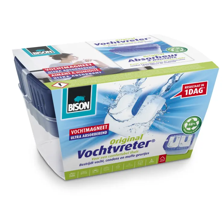 Vochtvreter® bestrijd condens, vocht en muffe geurtjes. Vochtvreter® is reukloos, geluidloos, kost geen energie en gemakkelijk navulbaar. Vochtvreter® verlaagt een te hoge relatieve luchtvochtigheid in alle gesloten ruimtes met weinig of geen ventilatie. Ideaal voor de kelder, garage, zolder, kast, caravan, boot, schuur, ect.
