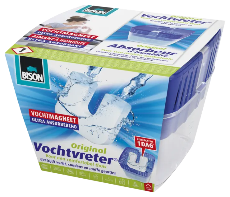 Vochtvreter® bestrijd condens, vocht en muffe geurtjes. Vochtvreter® is reukloos, geluidloos, kost geen energie en gemakkelijk navulbaar. Vochtvreter® verlaagt een te hoge relatieve luchtvochtigheid in alle gesloten ruimtes met weinig of geen ventilatie. Ideaal voor de kelder, garage, zolder, kast, caravan, boot, schuur, ect.