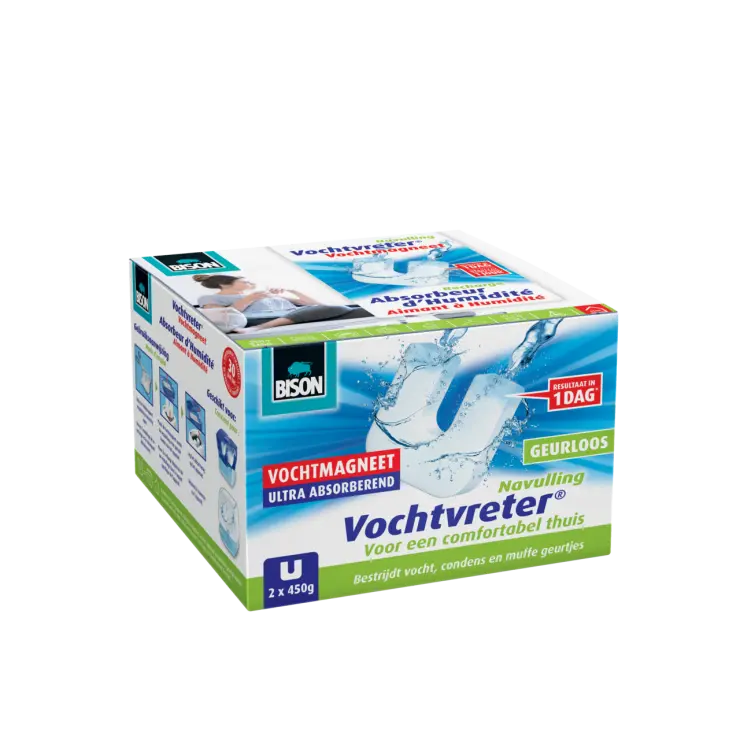 Vochtvreter® bestrijd condens, vocht en muffe geurtjes. Vochtvreter® is reukloos, geluidloos, kost geen energie en gemakkelijk navulbaar. Vochtvreter® verlaagt een te hoge relatieve luchtvochtigheid in alle gesloten ruimtes met weinig of geen ventilatie. Ideaal voor de kelder, garage, zolder, kast, caravan, boot, schuur, ect.